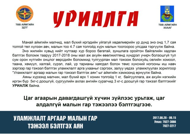 Засгийн газрын 2017 оны 186 дугаар тогтоолын дагуу энэ онд аймгийн аюулгүйн нөөцөд 380 тн өвс, 80 тн тэжээл, сум бүр 100 тн өвс, 50 тн тэжээл сумын аюулгүйн нөөцөд нөөцлөхөөр тогтоолд заагдаж, малчин өрхүүдэд цаг хүндэрсэн шаардлагатай үед өвс, тэжээлийн 3 хоногийн нөөц бүрдүүлэхээр аймгийн Засаг даргын А/434 дүгээр захирамж, төлөвлөгөө гарч аймгийн хэмжээнд 129,670,2 тн хадлан, 33,834 тн гар тэжээл бэлтгэх бөгөөд орон нутгийн нөөц боломжид тулгуурлан гар тэжээл бэлтгэх аяныг 8 сарын 28-аас 9 сарын 15-ны өдөр хүртэл зарлаж, хөдөлгөөн өрнүүлж эхлээд байна. Энэ талаар бид Төв аймгийн Хүнс, хөдөө аж ахуйн газрын Мал аж ахуйн хэлтсийн дарга М.Дашдуламаас тодруулга яриа авлаа.