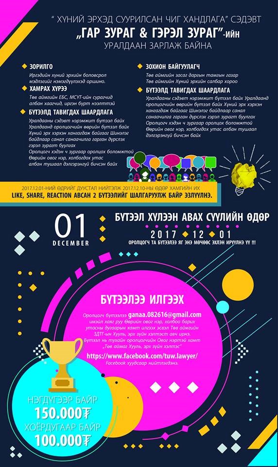 Бүтээл нь тухайн оролцогчийн Овог нэртэй хамт “Төв аймаг Хууль, эрх зүйн хэлтэс” https://www.facebook.com/tuw.lawyer/ Facebook хуудсаар нийтлэгдэнэ.